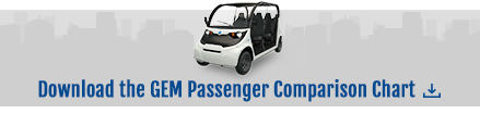 GEM is an all-electric powered low speed vehicle (LSV) that offers premium comfort, exceptional saftey features, low cost of ownership and industry leading custom solutions to fit any closed campus, on-road, or people moving need. Download the GEM Passenger Comparison Chart below for an in-depth understanding of individual specifications to show how GEM stacks up to the competition.